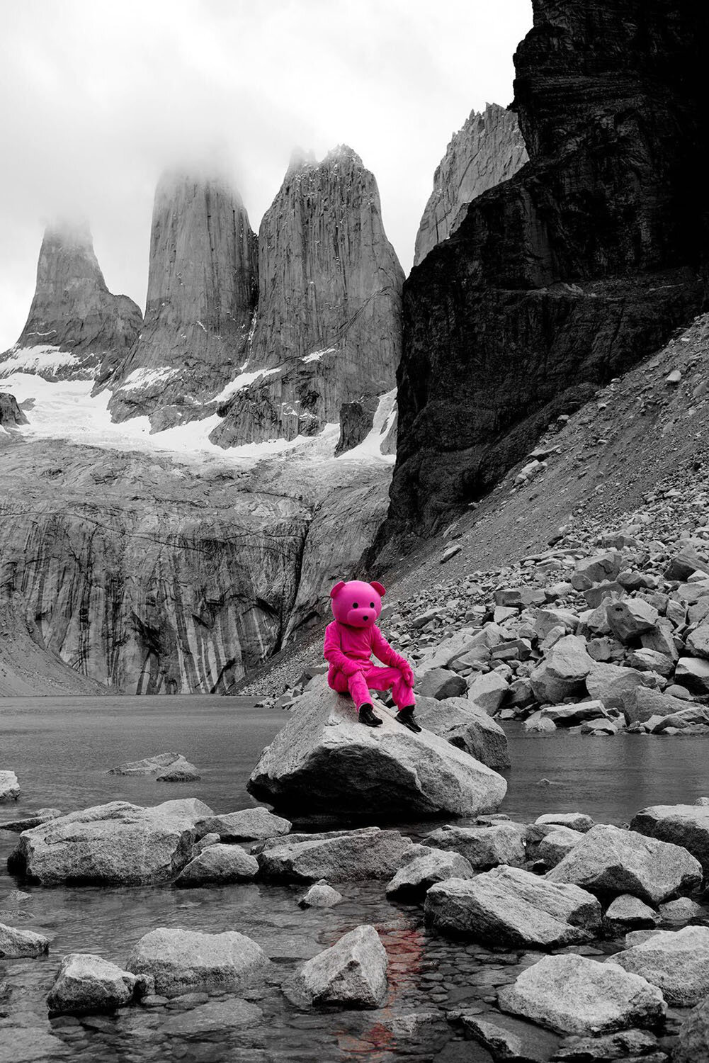 His most iconic series depicts a pink teddy bear come-to-life and placed in the real world acting as a metaphor for discovery and exploration. The costumed figure – a striking motif in his work – exists between reality and make-believe, youthful innocence and corruption, leading a lifestyle that looks simultaneously enviable and questionable.